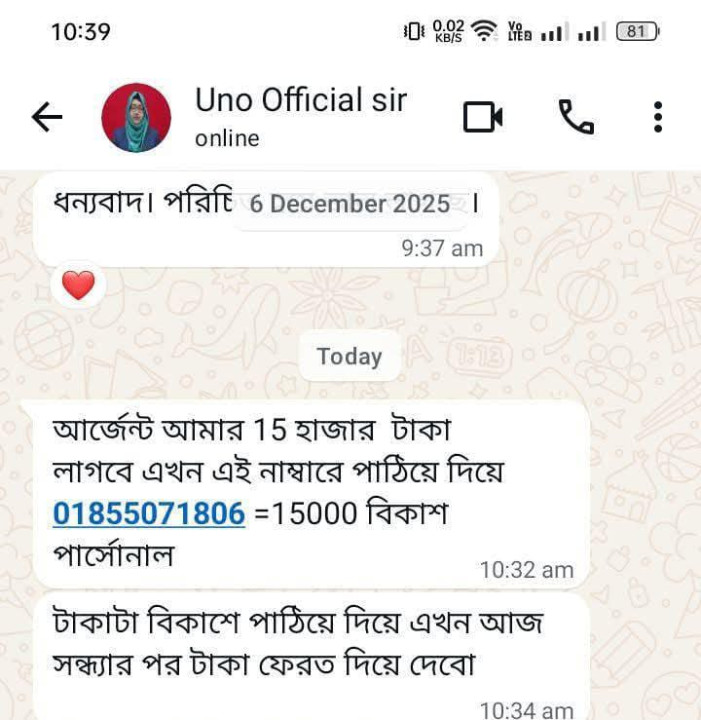চুয়াডাঙ্গা সদর উপজেলার উপজেলা নির্বাহী অফিসার (ইউএনও) রিফাত আরার ব্যবহৃত অফিসিয়াল হোয়াটসঅ্যাপ নম্বর হ্যাক হওয়ার ঘটনা ঘটেছে। বুধবার সকাল ১০টা ১০ মিনিটের দিকে নম্বরটি হ্যাক হয় বলে তিনি দৈনিক মাথাভাঙ্গাকে নিশ্চিত করেন। ঘটনার পরপরই ইউএনও রিফাত আরা তার ব্যবহৃত ফেসবুক প্রোফাইল ‘ইউএনও চুয়াডাঙ্গা সদর’ থেকে একটি সতর্কতামূলক স্ট্যাটাস দেন। সেখানে তিনি লেখেন, “সংশ্লিষ্ট সকলের অবগতির জন্য জানানো যাচ্ছে যে, উপজেলা নির্বাহী অফিসার সদর এর হোয়াটসঅ্যাপ আইডি হ্যাক হয়েছে। সংশ্লিষ্ট নম্বর থেকে বা ফেসবুক আইডি থেকে কেউ কোনো টাকা-পয়সা দাবি করলে কোনো ধরনের লেনদেন না করার জন্য অনুরোধ করছি।” এ ছাড়া সামাজিক যোগাযোগমাধ্যমে বিভিন্ন পোস্টের মাধ্যমে সাধারণ জনগণকে সতর্ক করা হয়, যাতে কেউ কোনো ধরনের আর্থিক লেনদেন বা সন্দেহজনক অনুরোধে সাড়া না দেন। ইউএনও রিফাত আরা জানান, এ ঘটনায় তিনি চুয়াডাঙ্গা সদর থানায় একটি সাধারণ ডায়েরি (জিডি) করেছেন। এ বিষয়ে চুয়াডাঙ্গা সদর থানার ভারপ্রাপ্ত কর্মকর্তা (ওসি) মিজানুর রহমান বলেন, উপজেলা নির্বাহী অফিসারের হোয়াটসঅ্যাপ নম্বর হ্যাক হওয়ার বিষয়ে অভিযোগ পাওয়া গেছে। বিষয়টি গুরুত্বের সঙ্গে খতিয়ে দেখা হচ্ছে এবং প্রয়োজনীয় ব্যবস্থা গ্রহণ করা হচ্ছে।
