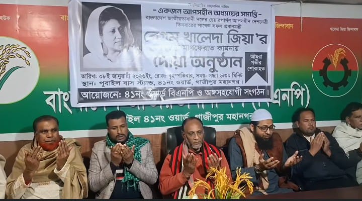 গাজীপুর মহানগরীর পূবাইল থানাধীন ৪১ নং ওয়ার্ডের পূবাইল বাস স্টেশন এলাকায় বিএনপি’র অফিসে দেশনেত্রী বেগম খালেদা জিয়ার রুহের মাগফেরাত কামনায় দোয়া মাহফিল ও তবারক বিতরণ অনুষ্ঠানের আয়োজন করা হয়। বৃহস্পতিবার (৮ জানুয়ারি ২০২৬ ইং) সন্ধ্যায় বিএনপি ও অঙ্গ সহযোগী সংগঠনের উদ্যোগে এ দোয়া মাহফিল অনুষ্ঠিত হয়। অনুষ্ঠানে বিপুলসংখ্যক নেতাকর্মী ও সমর্থকদের উপস্থিতিতে পূবাইল স্টেশন এলাকা পরিণত হয় এক আবেগঘন পরিবেশের। গাজীপুর মহানগর স্বেচ্ছাসেবক দলের নেতা মো. জহির উদ্দিন মোল্লার সার্বিক সহযোগিতায় আয়োজিত এ অনুষ্ঠানে উপস্থিত ছিলেন পূবাইল থানা বিএনপির সহ-সভাপতি শেখ তানভীর আহমেদ, সালাহউদ্দিন সরকার, পূবাইল থানা যুবদলের যুগ্ম আহ্বায়ক হারেজ আলী, পূবাইল থানা শ্রমিক দলের সহ-সভাপতি কাজী মনজুরুল ইসলাম, ৪১ নম্বর ওয়ার্ড বিএনপির সহ-সভাপতি কাজী হুমায়ুন, সাধারণ সম্পাদক আল-আমিন মোল্লা, ৪১ নম্বর ওয়ার্ড যুবদলের সাধারণ সম্পাদক পনির হোসেন, সেচ্ছাসেবক দল নেতা মো.জাহাঙ্গীর মোল্লাসহ আরো অসংখ্য নেতাকর্মী উপস্থিত ছিলেন। দোয়া মাহফিল শেষে উপস্থিত সকলের মাঝে তবারক বিতরণ করা হয়।