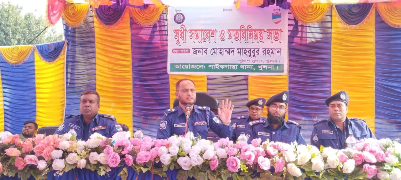 খুলনার পাইকগাছা থানা পুলিশের উদ্যোগে সুধী সমাবেশ ও মতবিনিময় সভা অনুষ্ঠিত হয়েছে। শনিবার (১০ জানুয়ারি) বেলা ১১টায় পাইকগাছা থানা চত্বরে আয়োজিত এ সভায় প্রধান অতিথি হিসেবে উপস্থিত ছিলেন খুলনা জেলা পুলিশ সুপার মোহাম্মদ মাহবুবুর রহমান। প্রধান অতিথির বক্তব্যে পুলিশ সুপার মোহাম্মদ মাহবুবুর রহমান বলেন, মাদক ও অবৈধ অস্ত্রের বিরুদ্ধে পুলিশের অবস্থান অত্যন্ত কঠোর। নির্বাচনকে কেন্দ্র করে কেউ যদি বিশৃঙ্খলা সৃষ্টি বা নির্বাচন বানচালের অপচেষ্টা করে, তবে তা কঠোর হাতে দমন করা হবে। আইনশৃঙ্খলা পরিস্থিতি স্বাভাবিক রাখতে পুলিশ সর্বোচ্চ পেশাদারিত্বের সঙ্গে কাজ করবে। অনুষ্ঠানে সভাপতিত্ব করেন পাইকগাছা থানার অফিসার ইনচার্জ (ওসি) মোঃ গোলাম কিবরিয়া। বিশেষ অতিথি হিসেবে উপস্থিত ছিলেন অতিরিক্ত পুলিশ সুপার এস. এম. আল বেরুনী এবং সহকারী পুলিশ সুপার (ডি-সার্কেল) আমির হামজা। ওসি (তদন্ত) মোঃ ইদ্রিসুর রহমানের সঞ্চালনায় অনুষ্ঠিত সভায় বক্তব্য রাখেন উপজেলা বিএনপির সম্মেলন প্রস্তুতি কমিটির আহ্বায়ক ডা. আব্দুল মজিদ, সদস্য সচিব এস. এম. এমদাদুল হক, পৌর বিএনপির সভাপতি আসলাম পারভেজ, সাবেক সাধারণ সম্পাদক এস. এম. এনামুল হক, উপজেলা মুক্তিযোদ্ধা কমান্ডের আহ্বায়ক গাজী রুহুল আমিন, জামায়াতে ইসলামী নেতা মাওলানা এস. এম. আমিনুল ইসলাম, মোঃ মমিন উদ্দিন সানা, প্রেসক্লাব পাইকগাছার সভাপতি প্রকাশ ঘোষ বিধান, রিপোর্টার্স ইউনিটির সভাপতি জি. এম. মিজানুর রহমান, কপিলমুনি প্রেসক্লাবের সভাপতি এইচ. এম. শফিউল আলম, শিক্ষক প্রতিনিধি বাহারুল ইসলাম ও আনিছুর রহমান, সাবেক পৌর কাউন্সিলর ও পৌর বিএনপির সাধারণ সম্পাদক সেলিম নেওয়াজ, ছাত্র প্রতিনিধি গাজী তানভীরসহ আরও অনেকে। সভায় রাজনৈতিক নেতৃবৃন্দ, বীর মুক্তিযোদ্ধা, সাংবাদিক, শিক্ষক, ছাত্র প্রতিনিধি ও বিভিন্ন শ্রেণি-পেশার মানুষ অংশগ্রহণ করেন। বক্তারা এলাকার আইনশৃঙ্খলা রক্ষা, মাদক নির্মূল ও আসন্ন নির্বাচন শান্তিপূর্ণভাবে সম্পন্ন করতে পুলিশ প্রশাসনের সঙ্গে সর্বাত্মক সহযোগিতার আশাবাদ ব্যক্ত করেন।