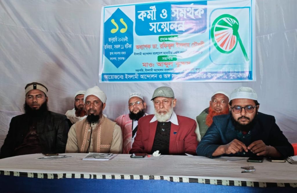 সুনামগঞ্জের মধ্যনগরে ইসলামী আন্দোলন বাংলাদেশের কর্মী ও সমর্থক সম্মেলন অনুষ্ঠিত হয়েছে। রবিবার (১১ জানুয়ারি) দুপুর ১২টায় মধ্যনগর সদর এলাকায় এ সম্মেলনের আয়োজন করা হয়। ইসলামী আন্দোলন বাংলাদেশ মধ্যনগর উপজেলা শাখার সভাপতি মাওলানা আব্দুল কুদ্দুসের সভাপতিত্বে অনুষ্ঠিত সম্মেলনটি সঞ্চালনা করেন উপজেলা শাখার সাধারণ সম্পাদক মাওলানা জিয়াউর রহমান। সম্মেলনে প্রধান অতিথি হিসেবে বক্তব্য রাখেন ইসলামী আন্দোলন বাংলাদেশ মনোনীত হাতপাখা প্রতীকের প্রার্থী সুনামগঞ্জ-১ আসনের আলহাজ্ব অধ্যাপক ডা. রফিকুল ইসলাম চৌধুরী। বিশেষ অতিথি হিসেবে বক্তব্য দেন ইসলামী আন্দোলন বাংলাদেশ সুনামগঞ্জ জেলা শাখার সাংগঠনিক সম্পাদক মুহাম্মদ নুরুদ্দিন, ইসলামী শ্রমিক আন্দোলন বাংলাদেশ সুনামগঞ্জ জেলা শাখার সহ-সাংগঠনিক সম্পাদক এম. সালমান আহমদ সুজন এবং ইসলামী শ্রমিক আন্দোলন বাংলাদেশ সিলেট মহানগর শাখার সভাপতি মুহাম্মদ সিদ্দিকুর রহমান ছোটন। এছাড়াও বক্তব্য রাখেন ইসলামী আন্দোলন বাংলাদেশ মধ্যনগর উপজেলা শাখার সহ-সাংগঠনিক সম্পাদক মাওলানা শিব্বির আহমদ, ইসলামী ছাত্র আন্দোলন বাংলাদেশ মধ্যনগর উপজেলা শাখার সভাপতি মুহাম্মদ মামুন হোসেনসহ উপজেলা শাখার অন্যান্য নেতৃবৃন্দ। বক্তারা তাঁদের বক্তব্যে ইসলামী আন্দোলন বাংলাদেশের আদর্শ, লক্ষ্য ও কর্মসূচি তুলে ধরে বলেন, একটি ন্যায়ভিত্তিক, দুর্নীতিমুক্ত ও ইনসাফপূর্ণ সমাজ প্রতিষ্ঠায় ইসলামী আন্দোলন বাংলাদেশ নিরলসভাবে কাজ করে যাচ্ছে। তারা আগামী জাতীয় নির্বাচনে ইসলামী আন্দোলন বাংলাদেশ মনোনীত হাতপাখা প্রতীকের প্রার্থীর পক্ষে ঐক্যবদ্ধভাবে কাজ করার জন্য নেতাকর্মীদের প্রতি আহ্বান জানান। সম্মেলনে মধ্যনগর উপজেলার বিভিন্ন ইউনিয়ন থেকে আগত ইসলামী আন্দোলন বাংলাদেশের বিপুলসংখ্যক কর্মী ও সমর্থক উপস্থিত ছিলেন।