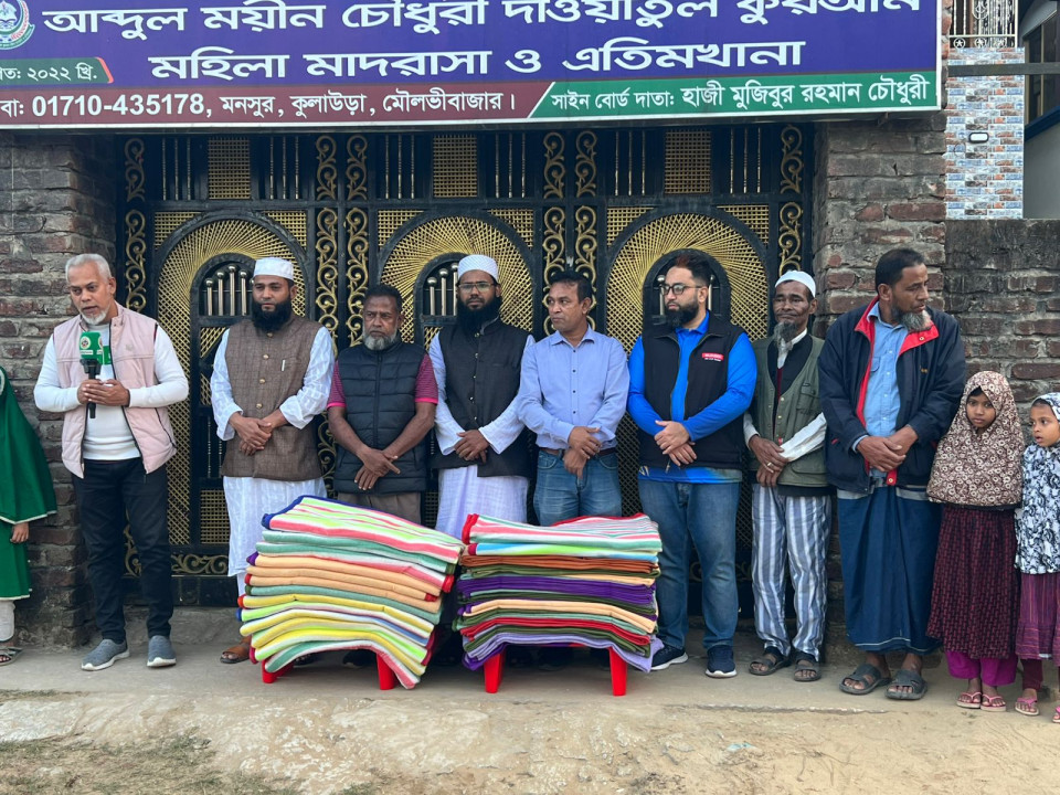 টিম জার্নালিস্ট ও সৈয়দ রাশিদ আলী ফাউন্ডেশনের যৌথ উদ্যোগে এবং বাংলাদেশ পুলিশের সাবেক এডিশনাল ডিআইজি মরহুম জালাল উদ্দিন চৌধুরী মাছুমের পরিবারের পক্ষ থেকে কুলাউড়ায় এতিম শিশুদের মাঝে দুই শতাধিক শীতবস্ত্র (কম্বল) বিতরণ করা হয়েছে। মঙ্গলবার (১৩ জানুয়ারি) বাদ জোহর কুলাউড়া উপজেলার আহমেদাবাদ জামেয়া মোহাম্মদিয়া দারুল উলুম মাদ্রাসা ও এতিমখানা, মনসুর আশরাফিয়া দারুল উলুম মাদ্রাসা ও এতিমখানা এবং আব্দুল ময়ীন চৌধুরী দাওয়াতুল কুরআন মহিলা মাদ্রাসা ও এতিমখানায় এসব কম্বল বিতরণ করা হয়। কম্বল বিতরণ অনুষ্ঠানে সাংবাদিক রফিকুল ইসলাম মামুনের সঞ্চালনায় এবং বাংলাদেশ সাংবাদিক সমিতি কুলাউড়া শাখার সাবেক সভাপতি, সিনিয়র সাংবাদিক ও সংবাদ বিশ্লেষক এম. মুক্তাদির হোসেনের সভাপতিত্বে প্রধান অতিথি হিসেবে উপস্থিত ছিলেন কুলাউড়া সার্কেলের অতিরিক্ত পুলিশ সুপার আজমল হোসেন। প্রধান অতিথির বক্তব্যে অতিরিক্ত পুলিশ সুপার আজমল হোসেন বলেন, এতিম ও অসহায় শিশুদের পাশে দাঁড়ানো একটি মহৎ মানবিক উদ্যোগ। সমাজের বিত্তবান ও সচেতন মানুষ এ ধরনের কাজে এগিয়ে এলে সামাজিক দায়বদ্ধতা আরও শক্তিশালী হবে।” সভাপতির বক্তব্যে এম. মুক্তাদির হোসেন বলেন, টিম জার্নালিস্ট কেবল সংবাদ প্রকাশেই নয়, বরং মানবিক ও সামাজিক কার্যক্রমের মাধ্যমে সমাজের পাশে দাঁড়াচ্ছে। এই উদ্যোগ তারই বাস্তব উদাহরণ।” স্মৃতিচারণ ও দোয়া এ সময় অতিথিরা মরহুম এডিশনাল ডিআইজি জালাল উদ্দিন চৌধুরী মাছুমের স্মৃতিচারণ করেন। বক্তারা বলেন, নিজ জন্মভূমি কুলাউড়ার প্রতি তাঁর গভীর ভালোবাসা ও টান ছিল। এলাকার মানুষের কল্যাণে তিনি আজীবন আন্তরিক ছিলেন। পরে তাঁর রুহের মাগফিরাত কামনা করে বিশেষ দোয়া ও মোনাজাত করা হয়। অনুষ্ঠানে আরও উপস্থিত ছিলেন আমেনা মিষ্টি ঘরের স্বত্বাধিকারী জাহের আলম চৌধুরী, প্রথম শ্রেণির ঠিকাদার রুহিন আহমদ, টিম জার্নালিস্টের সদস্য সামসুদ্দিন বাবু, আজিজুল ইসলাম, আব্দুল জব্বার বাহার, নাইমুল ইসলাম, মো. তারেক আহমদ, মাহফুজুর রহমান মাহি, শাহরিয়ার চৌধুরী, মো. তাহমিদুর রহমানসহ এলাকার গণ্যমান্য ব্যক্তিবর্গ। মরহুম জালাল উদ্দিন চৌধুরী মাছুমের পরিবারের পক্ষ থেকে কম্বল বিতরণ কার্যক্রমে সার্বিক সহযোগিতা করেন তাঁর স্ত্রী বাংলাদেশ পেট্রোলিয়াম করপোরেশনের যুগ্ম সচিব নাজনিন পারভীন এবং তাঁর বড় ভাই সামসুল আরেফিন চৌধুরী। অনুষ্ঠান শেষে আয়োজকরা জানান, ভবিষ্যতেও অসহায়, এতিম ও সুবিধাবঞ্চিত মানুষের পাশে দাঁড়িয়ে মানবিক কার্যক্রম অব্যাহত রাখা হবে।