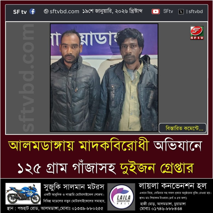 চুয়াডাঙ্গার আলমডাঙ্গায় মাদকবিরোধী বিশেষ অভিযানে ১২৫ গ্রাম গাঁজাসহ দুইজনকে গ্রেপ্তার করেছে থানা পুলিশ। শুক্রবার (১৭ জানুয়ারি ২০২৬) রাত আনুমানিক ১০টা ৩৫ মিনিটের সময় গোপন সংবাদের ভিত্তিতে আলমডাঙ্গা থানার হাটবোয়ালিয়া ক্যাম্পের এসআই (নিঃ) মোঃ মিজানুর রহমান সঙ্গীয় ফোর্সসহ অভিযান পরিচালনা করেন। অভিযানকালে আলমডাঙ্গা থানাধীন ভাংবাড়িয়া প্রাইমারি স্কুলপাড়া এলাকার একটি কাঁচা রাস্তার ওপর থেকে ভাংবাড়িয়া (প্রাইমারি স্কুলপাড়া) গ্রামের মোঃ উজ্জল বিশ্বাস (৪২), পিতা- মৃত রামজেদ আলী, মাতা- রাবিয়া খাতুন এবং নগরবোয়ালিয়া (গোরস্থানপাড়া) গ্রামের মোঃ অনিক (২৪), পিতা- মৃত আজিবার রহমান, মাতা- ফুলমালা খাতুন—এই দুইজনকে ১২৫ (একশত পঁচিশ) গ্রাম গাঁজাসহ হাতেনাতে গ্রেপ্তার করা হয়। পরে উদ্ধারকৃত মাদকদ্রব্য জব্দ তালিকামূলে জব্দ করা হয়। এ ঘটনায় গ্রেপ্তারকৃত আসামিদের বিরুদ্ধে ২০১৮ সালের মাদকদ্রব্য নিয়ন্ত্রণ আইন এর ৩৬(১) ধারার সারণির ১৯(ক) ধারায় আলমডাঙ্গা থানায় একটি মামলা রুজু করা হয়েছে। পুলিশ জানায়, মাদক নির্মূলে এ ধরনের অভিযান অব্যাহত থাকবে।