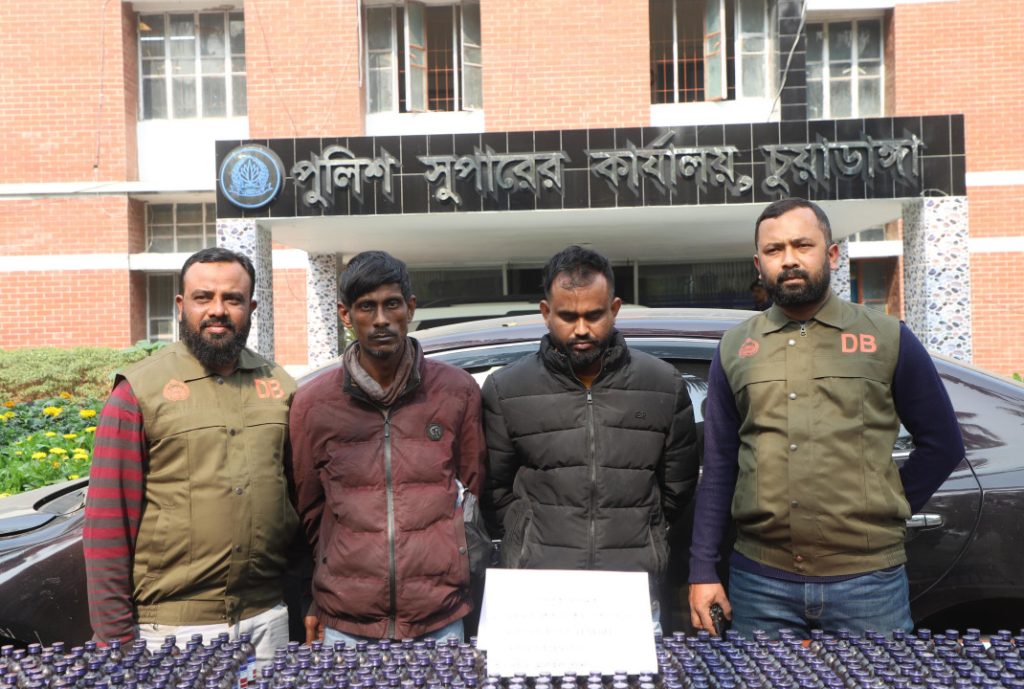 জেলা গোয়েন্দা শাখা (ডিবি) এক বিশেষ অভিযানে বিপুল পরিমাণ অবৈধ মাদকদ্রব্য ইসকাফ (ESkuf) উদ্ধার এবং দুইজনকে গ্রেপ্তার করেছে।ডিবি সূত্রে জানা যায়, বুধবার ২১ জানুয়ারি ভোর ৬টর দিকে দামুড়হুদা থানাধীন নাটুদহ ইউনিয়নের জগন্নাথপুর বাজার পাড়া মসজিদের সামনে পাকা সড়কে নিয়মিত চেকপোস্ট ডিউটির সময় একটি প্রাইভেট কারের গতিবিধি সন্দেহজনক মনে হলে সেটিকে থামানোর সংকেত দেওয়া হয়। কিন্তু চালক সংকেত অমান্য করে দ্রুত পালানোর চেষ্টা করে এবং ডিবির ভাড়ায় ডিউটিরত একটি মাইক্রোবাসে সজোরে ধাক্কা দেয়। এতে মাইক্রোবাসটি ক্ষতিগ্রস্ত হয়।বুধবার দেরটার সময় চুয়াডাঙ্গার পুলিশ সুপারের কার্যালয়ে অতিরিক্ত পুলিশ সুপার জামাল আল নাসের সাংবাদিকদের প্রেস ব্রিফিংয়ে বিস্তারিত জানান।পরবর্তীতে ডিবির অভিযানিক টিম ও সঙ্গীয় ফোর্সের সহায়তায় প্রাইভেট কারটি আটক করা হয়। গাড়ির ভেতরে থাকা দুই ব্যক্তি পালানোর চেষ্টা করলে তাদের গ্রেপ্তার করা হয়। এসময়রাজবাড়ী লক্ষীকোল এলাকার মৃত জব্বার সর্দার এর ছেলে মোঃ সাইদুল সরদার (৩৯), ও রাজবাড়ী বিনোদপুর কেয়াম উদ্দিন মল্লিকের ছেলে মোঃ শহীদুল ইসলাম (৩৫), কে আটক করে পুলিশ।তল্লাশি চালিয়ে তাদের হেফাজত থেকে মোট ৮৪০ বোতল নেশাজাতীয় কথিত মাদকদ্রব্য ইসকাফ (ESkuf) উদ্ধার করা হয়, যার আনুমানিক বাজারমূল্য ২৫ লাখ ২০ হাজার টাকা। এছাড়া একটি রেড ওয়াইন রঙের Premio প্রাইভেট কার (মূল্য আনুমানিক ২৫ লাখ টাকা), একটি বাটন মোবাইল ও একটি অ্যান্ড্রয়েড মোবাইল ফোন জব্দ করে পুলিশ ।এ ঘটনায় গ্রেপ্তারকৃত দুই আসামির বিরুদ্ধে দামুড়হুদা মডেল থানায় নিয়মিত মামলা রুজু করা হয়েছে।ডিবি কর্মকর্তারা জানান, মাদক ও চোরাচালান নির্মূলে এ ধরনের অভিযান আরও জোরদার করা হবে এবং অপরাধীদের আইনের আওতায় আনতে জেলা পুলিশ সর্বাত্মকভাবে কাজ করে যাচ্ছে।