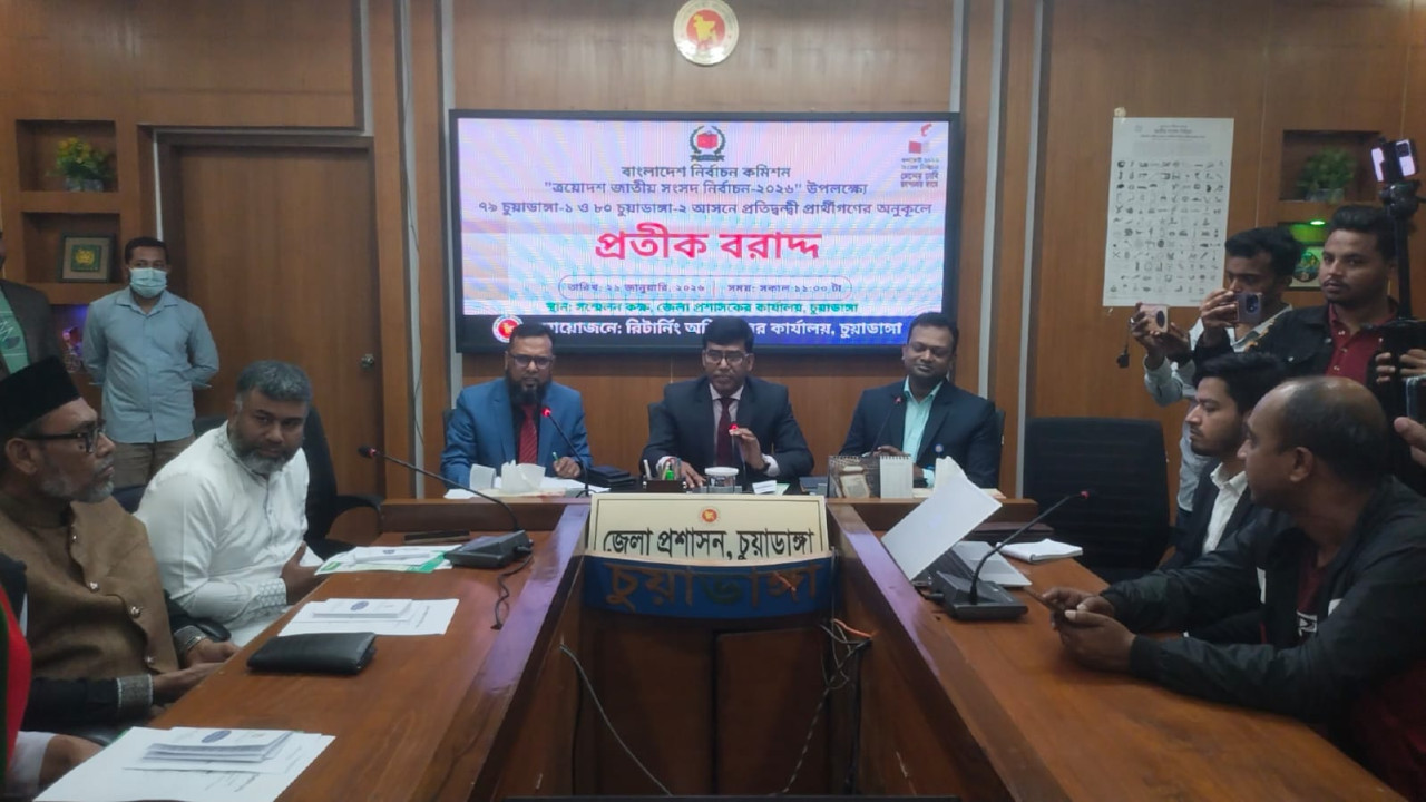 ত্রয়োদশ জাতীয় সংসদ নির্বাচন–২০২৬” উপলক্ষে চুয়াডাঙ্গা–১ (আসন–৭৯) ও চুয়াডাঙ্গা–২ (আসন–৮০) নির্বাচনী আসনের প্রতিদ্বন্দ্বী প্রার্থীদের অনুকূলে প্রতীক বরাদ্দ কার্যক্রম সম্পন্ন হয়েছে। বুধবার সকাল ১১টায় চুয়াডাঙ্গা জেলা প্রশাসকের কার্যালয়ের সম্মেলন কক্ষে এই প্রতীক বরাদ্দ অনুষ্ঠিত হয়। এতে সভাপতিত্ব করেন চুয়াডাঙ্গার জেলা প্রশাসক মোহাম্মদ কামাল হোসেন। অনুষ্ঠানে প্রার্থী ও তাঁদের প্রতিনিধিরা উপস্থিত ছিলেন।
