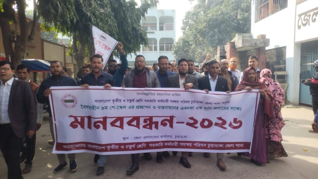 চুয়াডাঙ্গায় বৈষম্যহীন ৯ম পে-স্কেল ঘোষণা ও বাস্তবায়নের এক দফা দাবিতে বিশাল মানববন্ধন কর্মসূচি পালন করেছে সরকারি ৩য় ও ৪র্থ শ্রেণি কর্মচারীরা। আজ রোববার সকাল ১০টায় চুয়াডাঙ্গার জেলা প্রশাসকের কার্যালয় প্রাঙ্গণে মানববন্ধন অনুষ্ঠিত হয়। কর্মসূচিতে জেলার বিভিন্ন সরকারি দপ্তরের তৃতীয় ও চতুর্থ শ্রেণীর কর্মচারীরা অংশগ্রহণ করেন।