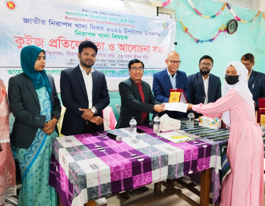চাঁপাইনবাবগঞ্জে বাংলাদেশ নিরাপদ খাদ্য কর্তৃপক্ষের আয়োজনে জাতীয় নিরাপদ খাদ্য দিবস–২০২৬ উদযাপন করা হয়েছে। এ উপলক্ষে নিরাপদ খাদ্য বিষয়ক কুইজ প্রতিযোগিতা ও আলোচনা সভা অনুষ্ঠিত হয় ২ ফেব্রুয়ারি সোমবার সকাল ১১টায় চাঁপাইনবাবগঞ্জ সরকারি মহিলা কলেজের হলরুমে এই কুইজ প্রতিযোগিতা ও আলোচনা সভা অনুষ্ঠিত হয়। “নিরাপদ খাদ্য নিশ্চিত করি, সুস্থ সবল জীবন গড়ি”—এই প্রতিপাদ্যকে সামনে রেখে দিবসটি উদযাপন করা হয়।অনুষ্ঠানে স্বাগত বক্তব্য প্রদান করেন চাঁপাইনবাবগঞ্জ নিরাপদ খাদ্য অফিসার মোঃ আব্দুল্লাহ্ আল মামুন। অনুষ্ঠানটি সঞ্চালনা করেন নবাবগঞ্জ সরকারি মহিলা কলেজের ইংরেজি বিভাগের সহযোগী অধ্যাপক ও অনুষ্ঠানের আহ্বায়ক মোঃ আমিনুল ইসলাম।