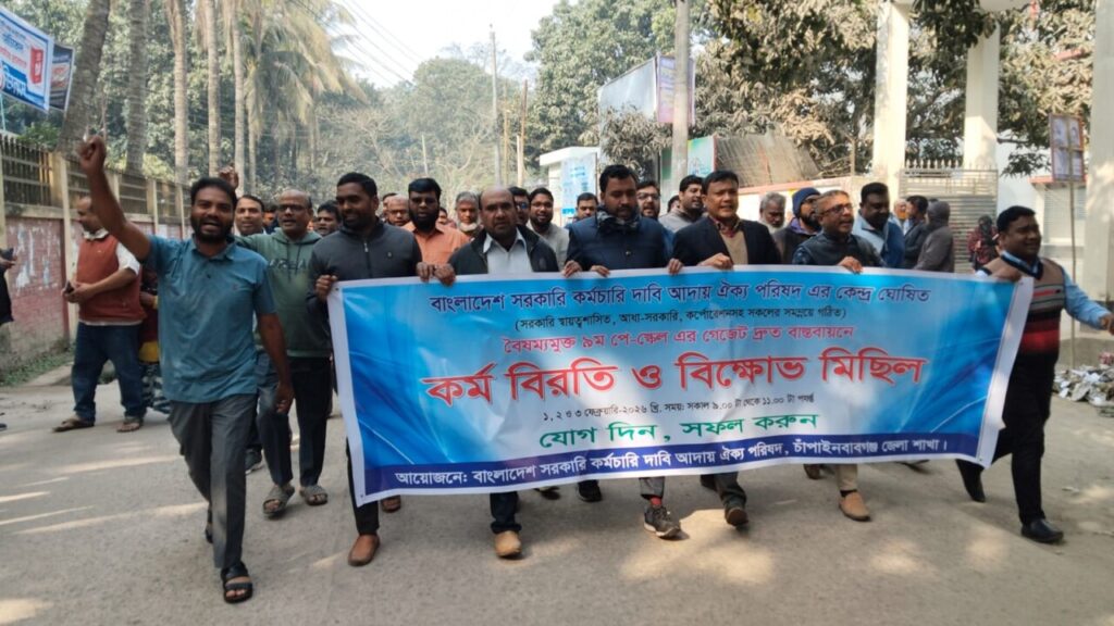 জাতীয় বেতন কমিশনের সুপারিশকৃত বৈষম্যহীন এক দফা দাবি অনুযায়ী ৯ম পে-স্কেলের গেজেট জারির দাবিতে চাঁপাইনবাবগঞ্জে অবস্থান ও বিক্ষোভ কর্মসূচি পালন করেছে বাংলাদেশ সরকারি কর্মচারী দাবি আদায় ঐক্য পরিষদ। আজ মঙ্গলবার (৩ ফেব্রুয়ারি) সকাল ১০টায় চাঁপাইনবাবগঞ্জ জেলা প্রশাসক কার্যালয় চত্বর থেকে একটি বিশাল মিছিল বের করা হয়। মিছিলটি শহরের প্রধান প্রধান সড়ক প্রদক্ষিণ শেষে আবারও জেলা প্রশাসক কার্যালয় চত্বরে গিয়ে শেষ হয়। সেখানে অবস্থান কর্মসূচির পাশাপাশি কর্মবিরতি পালন করেন কর্মচারীরা। এ কর্মসূচিতে অংশগ্রহণ করেন চাঁপাইনবাবগঞ্জ জেলা শাখার বিচার বিভাগীয় কর্মচারী এসোসিয়েশন ও কালেক্টরেট কর্মচারী সমিতির সদস্যরা। অবস্থান ও বিক্ষোভে বিচার বিভাগীয় কর্মচারী এসোসিয়েশনের সভাপতি মোঃ ওবাইদুল রহমান, সাধারণ সম্পাদক মোঃ মতিউর রহমান, সাংগঠনিক সম্পাদক সেলিম মাহমুদসহ সংগঠনের অন্যান্য নেতৃবৃন্দ উপস্থিত ছিলেন।এছাড়াও উপস্থিত ছিলেন সিজেএম আদালতের পেশকার মোঃ আনোয়ারুল ইসলাম, সিভিল সার্জনের কার্যালয়ের কর্মচারী মোঃ আব্দুর রাজ্জাক, কৃষি সম্প্রসারণ অধিদপ্তরের কর্মচারী মাহবুব রহমান, জেলা প্রশাসক কার্যালয়ের কর্মচারী মোঃ সুফিয়ানসহ বিভিন্ন দপ্তরের কর্মচারীরা। বক্তারা বলেন, দীর্ঘদিন ধরে বিচার বিভাগীয় কর্মচারীরা নানা বৈষম্যের শিকার হয়ে আসছেন। জাতীয় বেতন কমিশনের সুপারিশ বাস্তবায়ন না হওয়ায় কর্মচারীদের ন্যায্য অধিকার থেকে বঞ্চিত করা হচ্ছে। দ্রুত বৈষম্যমুক্ত ৯ম পে-স্কেলের গেজেট জারি ও বাস্তবায়ন না করা হলে ভবিষ্যতে ঢাকায় আরও কঠোর অবস্থান ও বিক্ষোভ কর্মসূচি গ্রহণ করা হবে বলে সরকারকে হুঁশিয়ারি দেন তারা।