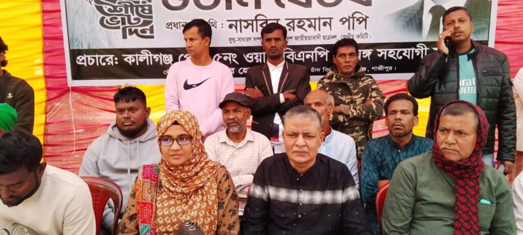 আসন্ন ত্রয়োদশ জাতীয় সংসদ নির্বাচন উপলক্ষে গাজীপুর-৫ (কালীগঞ্জ, পূবাইল, বাড়িয়া) আসনে বিএনপির মনোনীত প্রার্থী একেএম ফজলুল হক মিলনের পক্ষে নির্বাচনী উঠান বৈঠক অনুষ্ঠিত হয়েছে।শনিবার (৭ই ফেব্রুয়ারী) বিকাল ৪ ঘঠিকার সময় পৌর ৫নং ওয়ার্ড বালীগাঁও গ্রামে, নজম উদ্দিন মেম্বার বাড়ি জামে মসজিদ সংলগ্ন মাঠে, উঠান বৈঠক টি চাঁদ বিল্ডার্সের স্বত্বাধিকারী মো. আনোয়ার হোসেনের সার্বিক তত্ত্বাবধানে অনুষ্ঠিত হয়েছে।উঠান বৈঠকটি পবিত্র কোরআন তেলোয়াতের মাধ্যমে শুরু হয়। পবিত্র কোরআন থেকে তেলোয়াত করেন মো. রেজাউল করিম। গীতা পাঠ করেন অধীর চন্দ্র দাস।কালীগঞ্জ উপজেলা সেচ্ছাসেবক দলের সাবেক সাধারণ সম্পাদক আফাজ উদ্দিন আফাজের সভাপতিত্বে ও পৌর সেচ্ছাসেবক দলের সাবেক সহ-সভাপতি আলাউদ্দিন খাঁনের সঞ্চালনায়, উঠান বৈঠকে প্রধান অতিথি হিসেবে উপস্থিত ছিলেন, কেন্দ্রীয় ছাত্রদলের যুগ্ম সাধারণ সম্পাদক নাসরিন রহমান পপি। বিশেষ অতিথি হিসেবে উপস্থিত ছিলেন, তিতুমীর কলেজ শাখা ছাত্রদলের সাবেক যুগ্ম সাধারণ সম্পাদক নজরুল ইসলাম।উঠান বৈঠকে বক্তব্য রাখেন: গাজীপুর জেলা ছাত্র দলের সাবেক সিনিয়র সহ সভাপতি মোঃ নাছিবুর রহমান, বিএনপির নেতা জাহাঙ্গীর হোসেন অরুন, সর্ন কমল দাস, নুরুন নেছা কলেজের অধ্যাপক কামরুজ্জামান (পনির), পৌর ৫নং ওয়ার্ড যুবদলের সভাপতি ছাইফুল ইসলাম, যুগ্ম সাধারণ সম্পাদক খায়রুল হাসান (মিন্টু), পৌর ছাত্র দলের যুগ্ম আহ্বায়ক মেরাজ হোসেন রানা প্রমুখ।প্রধান অতিথি নাসরিন রহমান পপি তার বক্তব্যে বলেন, বাংলাদেশকে একটি উন্নত দেশে রুপান্তর করতে আমাদের ১২ তারিখে ধানের শীষের বিজয় নিশ্চিত করতে হবে।তিনি পৌর ৫নং ওয়ার্ডের মা-বোন, দলীয় নেতাকর্মী সহ এলাকার সকলের কাছে বিএনপির মনোনীত প্রার্থী একেএম ফজলুল হক মিলনের জন্য দোয়া ও ধানের শীষের জন্য ভোট প্রার্থানা করেন।ভোট প্রার্থনার পরে সকলে স্লোগান দেয়, তারুণ্যের প্রথম ভোট ধানের শীষের পক্ষে হোক, করবো কাজ গরবো দেশ সবার আগে বাংলাদেশ, ভোট দিবো কিসে ধানের শীষে, তারেক রহমানের সালাম নিন ধানের শীষে ভোট দিন, মিলন ভাইয়ের সালাম নিন ধানের শীষে ভোট দিন, লাগারে লাগা ধান লাগা, ১২ তারিখ সারা দিন ধানের শীষে ভোট দিন।
