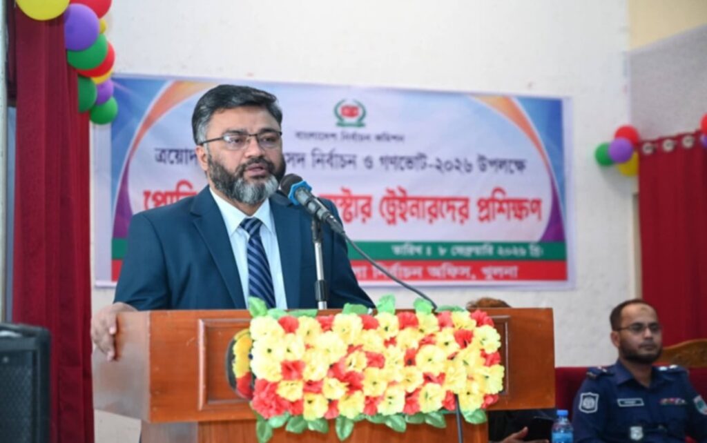 ত্রয়োদশ জাতীয় সংসদ নির্বাচন ও গণভোট-২০২৬কে সামনে রেখে খুলনা জেলা নির্বাচন অফিসের আয়োজনে পোলিং এজেন্টদের মাস্টার ট্রেইনারদের প্রশিক্ষণ কর্মসূচি অনুষ্ঠিত হয়েছে। রবিবার (৮ ফেব্রুয়ারি) সকালে খুলনা পাবলিক কলেজের অডিটরিয়ামে এ প্রশিক্ষণ কর্মসূচি অনুষ্ঠিত হয়।প্রশিক্ষণ কর্মসূচিতে প্রধান অতিথি হিসেবে উপস্থিত ছিলেন খুলনা জেলা প্রশাসক ও বিজ্ঞ জেলা ম্যাজিস্ট্রেট আ. স. ম. জামশেদ খোন্দকার। বিশেষ অতিথি হিসেবে উপস্থিত ছিলেন খুলনা জেলার পুলিশ সুপার মোহাম্মদ মাহবুবুর রহমান এবং আঞ্চলিক নির্বাচন কর্মকর্তা ফয়সল কাদের।অনুষ্ঠানে স্বাগত বক্তব্য প্রদান করেন সিনিয়র জেলা নির্বাচন অফিসার, খুলনা মোঃ সোহেল সামাদ।প্রশিক্ষণে পোলিং এজেন্টদের দায়িত্ব ও কর্তব্য, নির্বাচন সংক্রান্ত আইন-কানুন, ভোটগ্রহণ প্রক্রিয়া, আচরণবিধি এবং ভোটকেন্দ্রে শৃঙ্খলা ও নিরাপত্তা নিশ্চিতকরণ বিষয়ে বিস্তারিত আলোচনা করা হয়। বক্তারা অবাধ, সুষ্ঠু ও নিরপেক্ষ নির্বাচন অনুষ্ঠানে পোলিং এজেন্টদের দক্ষতা ও পেশাদারিত্বের গুরুত্ব তুলে ধরেন।অনুষ্ঠানে নির্বাচন সংশ্লিষ্ট কর্মকর্তা-কর্মচারীসহ বিভিন্ন পর্যায়ের মাস্টার ট্রেইনাররা উপস্থিত ছিলেন।