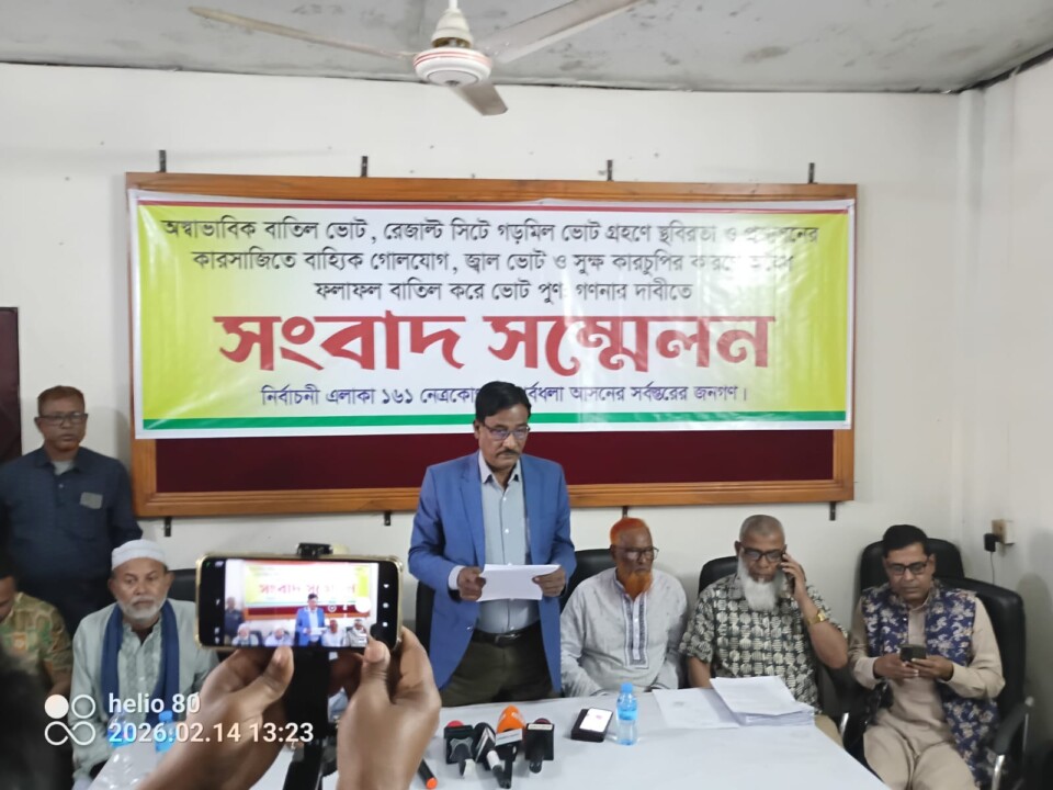 নেত্রকোনা-৫ (পূর্বধলা) আসনে নির্বাচনে অনিয়ম, কারচুপি ও সহিংসতার অভিযোগ তুলে ফলাফল স্থগিত এবং ভোট পুনর্গণনার দাবি জানিয়েছেন বিএনপি মনোনীত ধানের শীষ প্রতীকের প্রার্থী মো. আবু তাহের তালুকদার।শনিবার (১৪ ফেব্রুয়ারি) দুপুরে পূর্বধলা প্রেসক্লাবে আয়োজিত এক সংবাদ সম্মেলনে তিনি এই দাবি জানান। লিখিত বক্তব্যে তিনি অভিযোগ করেন, গত ১২ ফেব্রুয়ারি অনুষ্ঠিত নির্বাচনে বিভিন্ন কেন্দ্রে প্রশাসনের কিছু অসাধু কর্মকর্তা-কর্মচারীর সহযোগিতায় ব্যাপক অনিয়ম সংঘটিত হয়েছে।আবু তাহের তালুকদার অভিযোগ করেন, মেঘশিমুল সরকারি প্রাথমিক বিদ্যালয় কেন্দ্রে (কেন্দ্র নং-১০) প্রিজাইডিং কর্মকর্তা বিকেল ৩টার দিকে ভোটগ্রহণ স্থগিত করে কেন্দ্র ত্যাগ করেন। পরবর্তীতে প্রশাসনের হস্তক্ষেপে স্বল্প সময়ের জন্য পুনরায় ভোট গ্রহণ করা হয়। এছাড়া অন্য একটি কেন্দ্রে সহকারী প্রিজাইডিং কর্মকর্তার বিরুদ্ধে ভোটারদের পরিচয় নিশ্চিত না করেই ব্যালট পেপার সরবরাহের অভিযোগ তোলেন তিনি। আলমপুর সরকারি প্রাথমিক বিদ্যালয় কেন্দ্রে (কেন্দ্র নং-৭৯) ভোট গণনা শেষ হওয়ার আগেই তার এজেন্টকে ফলাফল শিটে স্বাক্ষর দিতে চাপ প্রয়োগ করা হয় এবং আপত্তি জানালে প্রশাসনের মাধ্যমে ভয়ভীতি দেখিয়ে মনগড়া ফলাফল ঘোষণা করা হয়। অন্যদিকে, মেঘশিমুল উচ্চ বিদ্যালয় কেন্দ্রে (কেন্দ্র নং-১৪) বুথের সংখ্যা কমিয়ে কৃত্রিম দীর্ঘ লাইনের সৃষ্টি করা হয়, যার ফলে অনেক নারী ভোটার ভোট দিতে না পেরে কেন্দ্র ত্যাগ করতে বাধ্য হন।সংবাদ সম্মেলনে প্রার্থী আরও জানান, উপজেলার নারায়ণডহর বাজার, বিশকাকুনীর ধোবারুহি বাজার এবং ধলামূলগাঁও এলাকায় তার নেতাকর্মীদের ওপর অতর্কিত হামলা চালানো হয়েছে। এ সময় ব্যবসা প্রতিষ্ঠানে ভাঙচুর ও নগদ টাকা লুটপাটের ঘটনাও ঘটেছে, এর প্রেক্ষিতে থানায় দুটি পৃথক অভিযোগ দায়ের করা হয়েছে।সহকারী রিটার্নিং কর্মকর্তার ঘোষিত ফলাফল অনুযায়ী ধানের শীষ ও প্রতিদ্বন্দ্বী প্রার্থীর মধ্যে ভোটের ব্যবধান ২ হাজার ৬৫৭।প্রার্থী দাবি করেন, এই অনিয়ম ও কারচুপি না হলে ফলাফল তার পক্ষেই আসত। তিনি অবিলম্বে ফলাফল স্থগিত রেখে নিরপেক্ষ তদন্তের মাধ্যমে সব কেন্দ্রের ভোট পুনর্গণনার দাবি জানান এবং দায়ীদের বিরুদ্ধে দ্রুত আইনগত ব্যবস্থা গ্রহণের আহ্বান জানান।ইতিপূর্বে এসব বিষয়ে জেলার রিটার্নিং কর্মকর্তার কাছে লিখিত অভিযোগ দাখিল করা হয়েছে বলেও তিনি উল্লেখ করেনএ সময় উপজেলা বিএনপির সিনিয়র যুগ্ন আহবায়ক আলহাজ্ব বাবুল আলম তালুকদার, জেলা বিএনপির সাবেক সহ সভাপতি আব্দুর রহিম, উপজেলা বিএনপির যুগ্ম আহবায়ক হাবিবুর রহমান ফকির, ইশতিয়াক আহমেদ বাবু, আনোয়ারুল ইসলাম আনার সহ বিএনপির অঙ্গ ও সহযোগী সংগঠনের নেতৃবৃন্দ উপস্থিত 