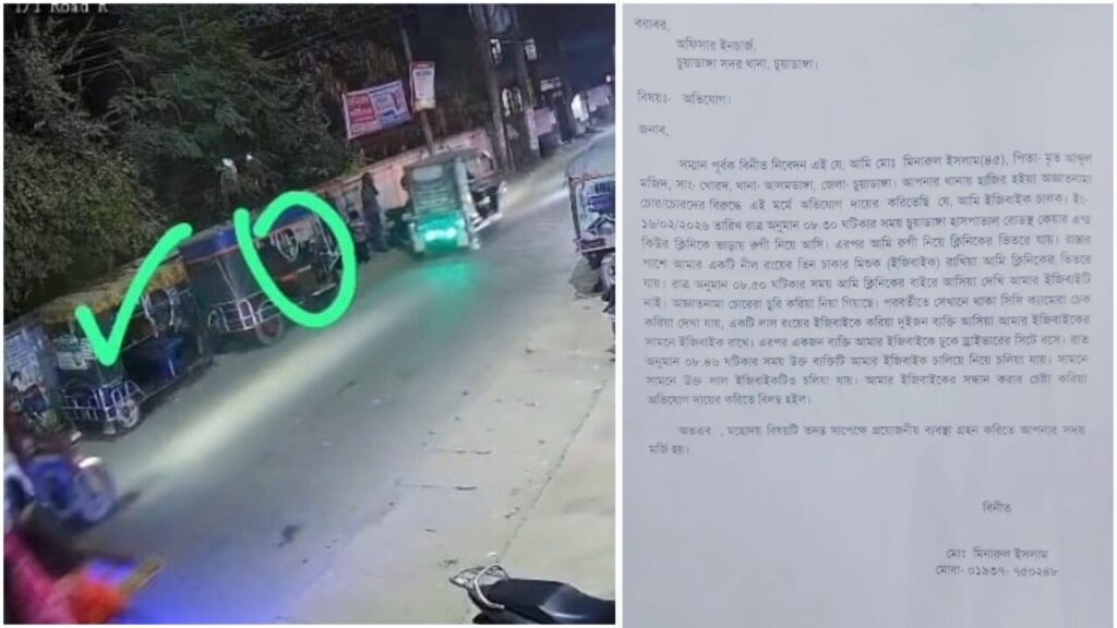 চুয়াডাঙ্গা সদর থানায় একটি ইজিবাইক চুরির অভিযোগ দায়ের করা হয়েছে। ভুক্তভোগী মোঃ মিনারুল ইসলাম (৪৫), পিতা—মৃত আব্দুল মজিদ, সাং—খোরপাড়া, থানা—আলমডাঙ্গা, জেলা—চুয়াডাঙ্গা।লিখিত অভিযোগে তিনি জানান, গত ১৬ ফেব্রুয়ারি ২০২৬ তারিখ রাত আনুমানিক ৮টা ৩০ মিনিটের সময় চুয়াডাঙ্গা হাসপাতাল রোডের কেয়ার অ্যান্ড কিউর ক্লিনিকে একজন রোগী নিয়ে আসেন। পরে রোগীকে ক্লিনিকের ভেতরে নিয়ে যাওয়ার সময় তিনি তার নীল রঙের তিন চাকার ইজিবাইকটি রাস্তার পাশে রেখে যান।অভিযোগে আরও উল্লেখ করা হয়, রাত আনুমানিক ৮টা ৫০ মিনিটে ক্লিনিকের বাইরে এসে তিনি দেখতে পান তার ইজিবাইকটি আর সেখানে নেই। পরবর্তীতে আশপাশে খোঁজাখুঁজি করে না পেয়ে তিনি ক্লিনিকের সিসি ক্যামেরা ফুটেজ পরীক্ষা করেন। ফুটেজে দেখা যায়, একটি লাল রঙের ইজিবাইকযোগে দু’জন ব্যক্তি এসে তার ইজিবাইকের সামনে অবস্থান নেয়। এরপর তাদের একজন তার ইজিবাইকে উঠে বসে এবং কিছুক্ষণ পর সেটি চালিয়ে নিয়ে চলে যায়। একই সঙ্গে সামনের লাল রঙের ইজিবাইকটিও ঘটনাস্থল ত্যাগ করে।ভুক্তভোগী তার চুরি হওয়া ইজিবাইকটি উদ্ধারের জন্য থানায় লিখিত অভিযোগ দায়ের করেছেন এবং এ বিষয়ে প্রয়োজনীয় আইনগত ব্যবস্থা গ্রহণের জন্য প্রশাসনের সহায়তা কামনা করেছেন।