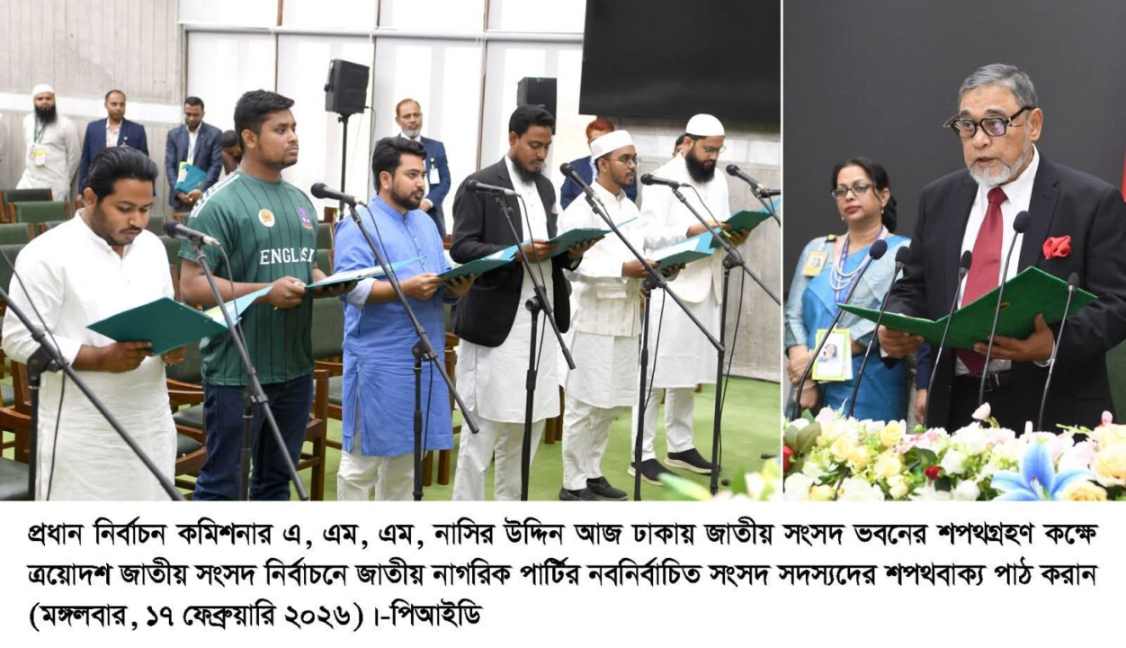 ঢাকা প্রতিনিধি: ত্রয়োদশ জাতীয় সংসদ নির্বাচনে বিজয়ী জাতীয় নাগরিক পার্টি–এর নবনির্বাচিত সংসদ সদস্যরা আজ শপথ গ্রহণ করেছেন। মঙ্গলবার (১৭ ফেব্রুয়ারি ২০২৬) সকালে রাজধানীর জাতীয় সংসদ ভবন–এর শপথগ্রহণ কক্ষে এ আনুষ্ঠানিকতা সম্পন্ন হয়।শপথ অনুষ্ঠান পরিচালনা করেন প্রধান নির্বাচন কমিশনার এ এম এম নাসির উদ্দিন। তিনি নবনির্বাচিত সংসদ সদস্যদের শপথবাক্য পাঠ করান এবং সাংবিধানিক দায়িত্ব যথাযথভাবে পালনের আহ্বান জানান।অনুষ্ঠানে নির্বাচন কমিশনের ঊর্ধ্বতন কর্মকর্তা, সংসদ সচিবালয়ের সংশ্লিষ্ট ব্যক্তিবর্গ এবং আমন্ত্রিত অতিথিরা উপস্থিত ছিলেন। শপথ গ্রহণের মধ্য দিয়ে জাতীয় নাগরিক পার্টির নবনির্বাচিত এমপিরা আনুষ্ঠানিকভাবে সংসদীয় কার্যক্রমে অংশ নেওয়ার যোগ্যতা অর্জন করেন।উল্লেখ্য, সদ্য অনুষ্ঠিত জাতীয় সংসদ নির্বাচনে দলটি উল্লেখযোগ্য সংখ্যক আসনে বিজয় লাভ করে, যার ধারাবাহিকতায় আজকের এই শপথগ্রহণ অনুষ্ঠিত হলো