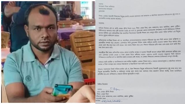 চুয়াডাঙ্গার আলমডাঙ্গায় এক সহকারী শিক্ষকের বিরুদ্ধে চাকরি দেওয়ার প্রলোভনে অর্থ আত্মসাত ও অনৈতিক আচরণের গুরুতর অভিযোগ উঠেছে। এ ঘটনায় ভুক্তভোগী তরুণী আলমডাঙ্গা উপজেলা শিক্ষা অফিসে বরাবর লিখিত অভিযোগ দায়ের করেছেন। অভিযোগটি এলাকায় চাঞ্চল্যের সৃষ্টি করেছে। লিখিত অভিযোগ সূত্রে জানা যায়, কুষ্টিয়া জেলার ঝাউদিয়া আস্তানগর গ্রামের বাসিন্দা মোছাঃ প্রীতি সিনহা (২৩) হাটবোলিয়া উচ্চ মাধ্যমিক বিদ্যালয়ের সহকারী শিক্ষক মোঃ আব্দুর রহিম ওরফে ‘রহিম মাস্টার’-এর বিরুদ্ধে এ অভিযোগ দায়ের করেন।