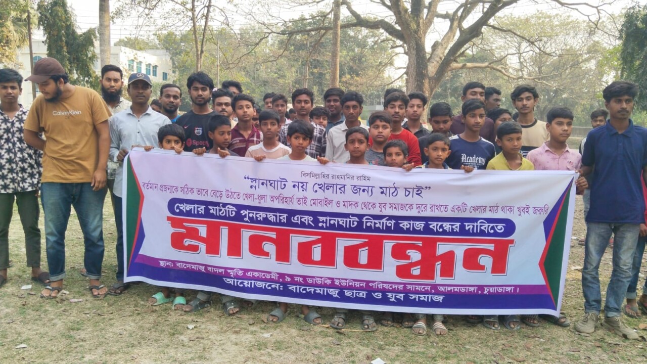 চুয়াডাঙ্গা জেলার আলমডাঙ্গা উপজেলার ৯ নং ডাউকি ইউনিয়নে খেলার মাঠ পুনরুদ্ধার ও স্নানঘাট নির্মাণ বন্ধের দাবিতে বিক্ষোভ ও মানববন্ধন কর্মসূচি পালন করেছে স্থানীয় যুব সমাজ, শিক্ষার্থী ও এলাকাবাসী।রবিবার (২২ ফেব্রুয়ারি) বিকেল ৩টায় উপজেলা পরিষদ চত্বরে এ মানববন্ধন অনুষ্ঠিত হয়। এর আগে ডাউকি ইউনিয়নের বাদেমাজু এলাকায় অবস্থিত বাদেমাজু বাদল স্মৃতি একাডেমী-র সামনে দীর্ঘদিনের খেলার মাঠ সংকট নিয়ে ক্ষোভ প্রকাশ করেন স্থানীয়রা।মানববন্ধনে অংশগ্রহণকারীরা ব্যানার ও ফেস্টুন হাতে স্লোগান দেন—“স্নানঘাট নয়, খেলার মাঠ চাই”,