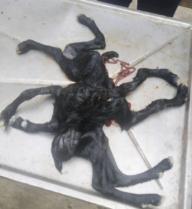 মণিরামপুর উপজেলায় এক বিরল ঘটনায় আটটি পা নিয়ে একটি ছাগলছানার জন্ম হয়েছে। মঙ্গলবার দুপুরে উপজেলা প্রাণিসম্পদ দপ্তরে এ ঘটনা ঘটে। খবর ছড়িয়ে পড়তেই এক নজর দেখতে পশু হাসপাতালে উৎসুক মানুষের ভিড় জমে। পশু হাসপাতাল সূত্রে জানা যায়, প্রসব বেদনা নিয়ে একটি ছাগলকে তার মালিক হাসপাতালে নিয়ে আসেন। ছাগলটির শারীরিক অবস্থা জটিল হওয়ায় চিকিৎসকরা দ্রুত অস্ত্রোপচার (সিজারিয়ান) করার সিদ্ধান্ত নেন। সফল অস্ত্রোপচারের মাধ্যমে বাচ্চাটি ভূমিষ্ঠ হয়। পরে দেখা যায়, স্বাভাবিক চারটি পায়ের পাশাপাশি অতিরিক্ত আরও চারটি পা রয়েছে ছাগলছানাটির শরীরে। উপজেলা প্রাণিসম্পদ দপ্তরের কর্মকর্তারা জানান, অস্ত্রোপচারের পর মা ছাগলটি বর্তমানে সুস্থ রয়েছে। নবজাতক ছাগলছানাটিকে নিবিড় পর্যবেক্ষণে রাখা হয়েছে এবং প্রয়োজনীয় চিকিৎসা সেবা দেওয়া হচ্ছে। চিকিৎসকদের মতে, এটি একটি জন্মগত শারীরিক গঠনগত ত্রুটি। ভ্রূণ গঠনের সময় জটিলতার কারণে এ ধরনের অতিরিক্ত অঙ্গের সৃষ্টি হতে পারে। প্রাণিসম্পদ কর্মকর্তারা জানান, এ ধরনের ঘটনা অত্যন্ত বিরল হলেও চিকিৎসা বিজ্ঞানে এর নজির রয়েছে। এই অস্বাভাবিক ও বিরল দৃশ্য দেখতে উপজেলার বিভিন্ন এলাকা থেকে মানুষ হাসপাতালে ভিড় করছেন। অনেক প্রত্যক্ষদর্শী একে প্রকৃতির বিস্ময়কর নিদর্শন কিংবা মহান আল্লাহর সৃষ্টির ব্যতিক্রমী ঘটনা হিসেবে দেখছেন। বাড়তি জনসমাগম সামলাতে হাসপাতাল কর্তৃপক্ষকে হিমশিম খেতে হচ্ছে। উপজেলা প্রাণিসম্পদ দপ্তর জানিয়েছে, ছাগলছানাটির জীবন রক্ষায় সর্বোচ্চ চিকিৎসা সহায়তা প্রদান করা হচ্ছে। প্রাণীটির শারীরিক অবস্থা পর্যবেক্ষণ করে পরবর্তী করণীয় নির্ধারণ করা হবে বলে সংশ্লিষ্টরা জানিয়েছেন।