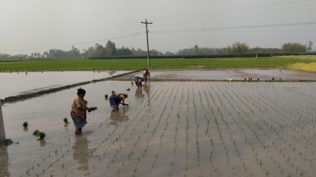 ঠাকুরগাঁও জেলার পীরগঞ্জ উপজেলার বাঁশগাড়া। গোধূলির আলো ধীরে ধীরে নেমে এসেছে ধানক্ষেতের ওপর। পশ্চিম আকাশে লালচে সূর্য ডুবে যাচ্ছে, জমির পানিতে তার প্রতিফলন ঝিকমিক করছে। সারাদিনের পরিশ্রমের শেষে হাঁটুসমান পানিতে দাঁড়িয়ে এখনো রোপা লাগাচ্ছেন লক্ষ্মী রাণী আর ববিতা রাণী। হাতের গতি কিছুটা ধীর, কিন্তু কথার ভাঁজে জমে আছে দিনের সারাংশ।লক্ষ্মী রাণী আকাশের রঙ বদলাতে বদলাতে বললেন,
