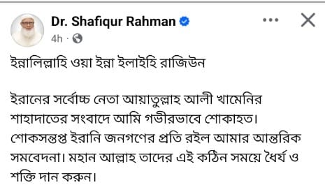 ফেসবুক পোস্টে তিনি লেখেন, “ইন্নালিল্লাহি ওয়া ইন্না ইলাইহি রাজিউন। ইরানের সর্বোচ্চ নেতা আয়াতুল্লাহ আলী খামেনির শাহাদাতের সংবাদে আমি গভীরভাবে শোকাহত। শোকসন্তপ্ত ইরানি জনগণের প্রতি রইল আমার আন্তরিক সমবেদনা। মহান আল্লাহ তাদের এই কঠিন সময়ে ধৈর্য ও শক্তি দান করুন।”