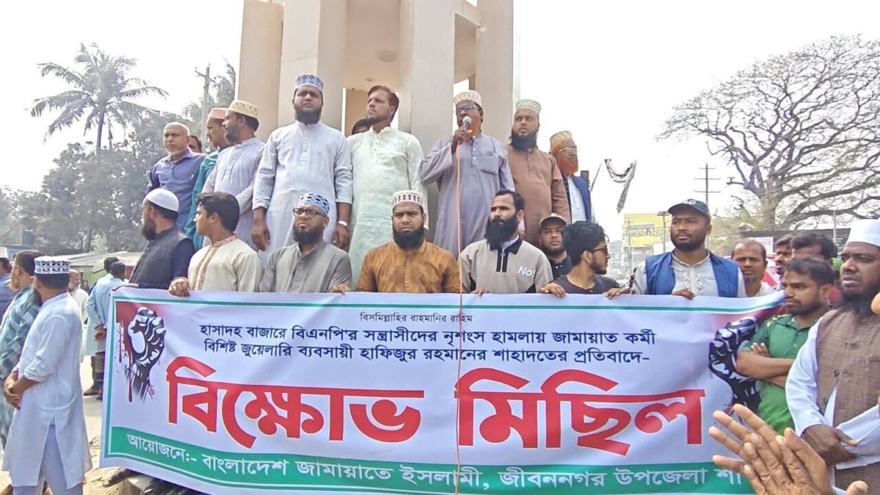 চুয়াডাঙ্গার জীবননগর উপজেলার হাসাদহ বাজারে হামলার ঘটনায় জামায়াত কর্মী ও বিশিষ্ট জুয়েলারি ব্যবসায়ী হাফিজুর রহমান নিহত হওয়ার অভিযোগে প্রতিবাদে বিক্ষোভ মিছিল অনুষ্ঠিত হয়েছে। রবিবার (১ মার্চ) বেলা ২টার দিকে জীবননগর উপজেলা শহরে এ কর্মসূচি পালিত হয়। মিছিলের আয়োজন করে বাংলাদেশ জামায়াতে ইসলামী জীবননগর উপজেলা শাখা। দলটির নেতাকর্মীরা দাবি করেন, হাসাদহ বাজার এলাকায় রাজনৈতিক বিরোধের জেরে তাদের কর্মী হাফিজুর রহমানের ওপর হামলা চালানো হয়। সংগঠনের পক্ষ থেকে অভিযোগ করা হয় যে, এ হামলার সঙ্গে বাংলাদেশ জাতীয়তাবাদী দল (বিএনপি)’র কিছু নেতাকর্মী জড়িত। তবে এ বিষয়ে বিএনপির পক্ষ থেকে তাৎক্ষণিক কোনো বক্তব্য পাওয়া যায়নি। মিছিলটি উপজেলা শহরের প্রধান সড়কগুলো প্রদক্ষিণ করে সংক্ষিপ্ত সমাবেশে মিলিত হয়। সমাবেশে বক্তারা ঘটনার তীব্র নিন্দা জানান এবং নিহত হাফিজুর রহমানকে “শহীদ” হিসেবে উল্লেখ করেন। তারা অবিলম্বে সুষ্ঠু তদন্ত, জড়িতদের গ্রেপ্তার এবং দৃষ্টান্তমূলক শাস্তির দাবি জানান। বক্তারা আরও বলেন, এ ধরনের সহিংস ঘটনা রাজনৈতিক পরিবেশকে অস্থিতিশীল করে তোলে এবং সাধারণ মানুষের মাঝে আতঙ্ক সৃষ্টি করে। তারা প্রশাসনের প্রতি নিরপেক্ষ তদন্ত ও দ্রুত বিচার প্রক্রিয়া নিশ্চিত করার আহ্বান জানান। কর্মসূচি চলাকালে আইনশৃঙ্খলা রক্ষাকারী বাহিনীর সদস্যরা এলাকায় সতর্ক অবস্থানে ছিলেন। শান্তিপূর্ণভাবে বিক্ষোভ কর্মসূচি সমাপ্ত হয়।