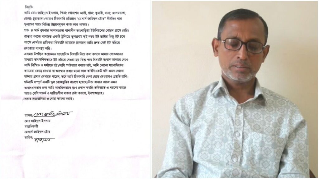 আমি মোঃ জাহিদুল ইসলাম, স্বত্বাধিকারী, জাহিদ ট্রেডার্স। আলমডাঙ্গা থানাধীন ভাংবাড়িয়া ইউনিয়নের খোরদ গ্রামে হেরিং রাস্তার কাজে ব্যবহৃত ইট সরবরাহের ঘটনায় যে ভুল বোঝাবুঝি সৃষ্টি হয়েছে, তার জন্য আমি আন্তরিকভাবে দুঃখ প্রকাশ করছি।