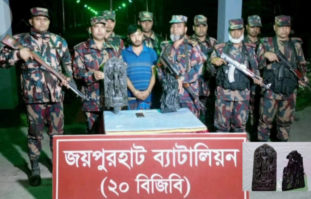 দিনাজপুরের বিরল উপজেলা সীমান্ত দিয়ে অবৈধভাবে ভারতে পাচারের সময় দুটি কষ্টিপাথরের মূর্তিসহ রাসেল ইসলাম (৩৩) নামের এক ব্যক্তিকে আটক করেছে Border Guard Bangladesh (বিজিবি)।শনিবার দিবাগত রাতে উপজেলার মঙ্গলপুর ইউনিয়নে অভিযান চালিয়ে জয়পুরহাট-২০ বিজিবি ব্যাটালিয়নের সদস্যরা তাকে আটক করেন। এ সময় তার বাড়ি থেকে একটি কষ্টিপাথরের মূর্তি উদ্ধার করা হয়। পরে আটককৃত ব্যক্তির দেওয়া তথ্যের ভিত্তিতে একই উপজেলার ফরক্কাবাদ গ্রাম থেকে পরিত্যক্ত অবস্থায় আরও একটি কষ্টিপাথরের মূর্তি উদ্ধার করা হয়।আটককৃত রাসেল ইসলাম দিনাজপুরের বিরল উপজেলার ধনগ্রামের মকবুল হোসেনের ছেলে।শনিবার বিকেলে আয়োজিত এক প্রেসব্রিফিংয়ে বিষয়টি নিশ্চিত করেছেন জয়পুরহাট-২০ বিজিবি ব্যাটালিয়নের অধিনায়ক লে. কর্নেল লতিফুল বারী। তিনি জানান, উদ্ধার হওয়া কষ্টিপাথরের মূর্তিগুলো সীমান্ত পথে ভারতে পাচারের চেষ্টা করা হচ্ছিল। এ ঘটনায় আটক ব্যক্তির বিরুদ্ধে আইনগত ব্যবস্থা নেওয়া হচ্ছে।
