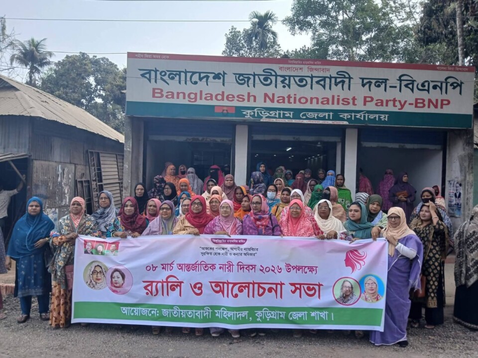আন্তর্জাতিক নারী দিবস উপলক্ষে কুড়িগ্রাম জেলা মহিলা দলের উদ্যোগে বর্ণাঢ্য র্যালি ও আলোচনা সভা অনুষ্ঠিত হয়েছে। অনুষ্ঠানে উপস্থিত ছিলেন কুড়িগ্রাম জেলা মহিলা দলের সিনিয়র সহ-সভাপতি অধ্যাপক নাজমুন নাহার বিউটি। তিনি নারীর অধিকার, মর্যাদা ও সমঅধিকার প্রতিষ্ঠার গুরুত্ব তুলে ধরে বক্তব্য দেন। বক্তব্যে তিনি বলেন, সমাজের সর্বস্তরে নারীর সম্মান ও অধিকার নিশ্চিত করতে সবাইকে ঐক্যবদ্ধভাবে কাজ করতে হবে। নারী উন্নয়ন ও ক্ষমতায়নের মাধ্যমে দেশকে আরও এগিয়ে নেওয়া সম্ভব বলেও তিনি উল্লেখ করেন। র্যালি ও আলোচনা সভায় জেলা মহিলা দলের নেতাকর্মীসহ বিভিন্ন শ্রেণি-পেশার নারীরা অংশগ্রহণ করেন।