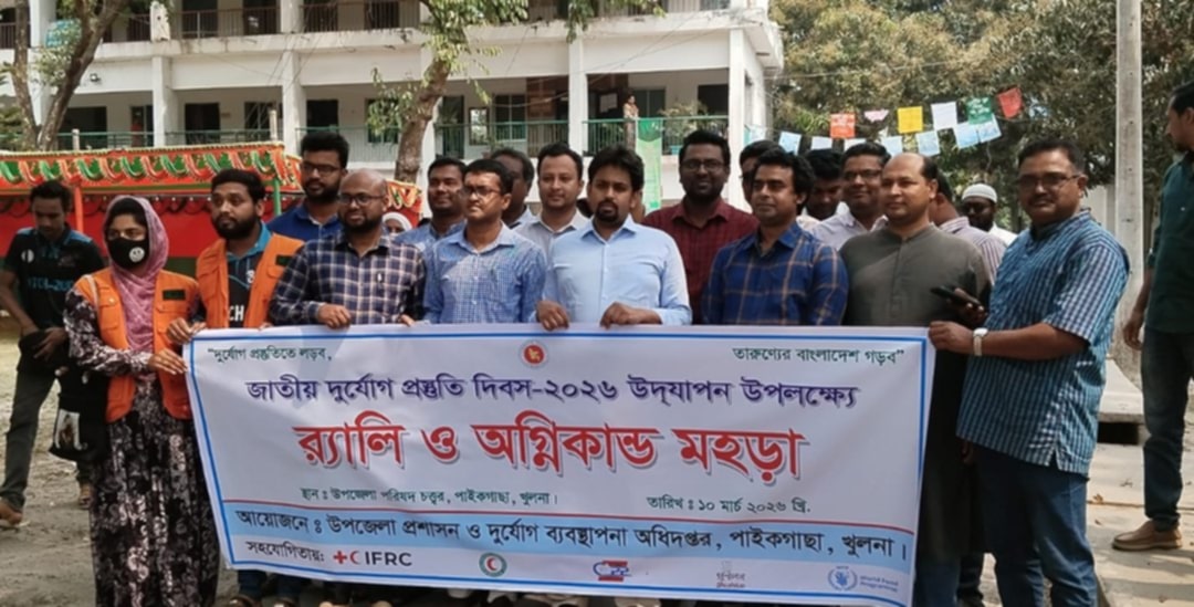 দুর্যোগ প্রস্তুতিতে লড়ব, তারুণ্যের বাংলাদেশ গড়বো” প্রতিপাদ্যকে সামনে রেখে খুলনার পাইকগাছায় জাতীয় দুর্যোগ প্রস্তুতি দিবস–২০২৬ পালন করা হয়েছে। দিবসটি উপলক্ষে র্যালি ও অগ্নিকাণ্ড বিষয়ক মহড়া অনুষ্ঠিত হয়।মঙ্গলবার (১০ মার্চ) সকালে উপজেলা পরিষদ চত্বরে উপজেলা প্রশাসন ও দুর্যোগ ব্যবস্থাপনা অধিদপ্তরের উদ্যোগে এ কর্মসূচির আয়োজন করা হয়। কর্মসূচির অংশ হিসেবে একটি সচেতনতামূলক র্যালি বের হয়ে সড়ক প্রদক্ষিণ করেন। অনুষ্ঠানে প্রধান অতিথি হিসেবে উপস্থিত ছিলেন উপজেলা নির্বাহী অফিসার ওয়াসিউজ্জামান চৌধুরী।উপজেলা প্রকল্প বাস্তবায়ন কর্মকর্তা (পিআইও) রাজীব বিশ্বাসের সভাপতিত্বে অনুষ্ঠানে আরও উপস্থিত ছিলেন উপজেলা সহকারী কমিশনার (ভূমি) মো. ফজলে রাব্বী, সিনিয়র উপজেলা মৎস্য কর্মকর্তা সৈকত মল্লিক, উপজেলা কৃষি কর্মকর্তা মো. একরামুল হোসেন, উপজেলা প্রকৌশলী মো. শাফিন শোয়েব, উপজেলা খাদ্য কর্মকর্তা মো. হাসিবুর রহমান, উপজেলা সমাজসেবা কর্মকর্তা অনাথ কুমার বিশ্বাস, প্রেসক্লাব পাইকগাছার সাধারণ সম্পাদক এম. জালাল উদ্দীন, পিআইও অফিসের সহকারী মোছা. ফাতেমা খাতুন, সুজয় মিস্ত্রি, মো. সুমন আল-মামুন, মো. মনির হোসেনসহ বিভিন্ন দপ্তরের কর্মকর্তা-কর্মচারী ও স্থানীয় ব্যক্তিবর্গ।অনুষ্ঠানে বক্তারা বলেন, প্রাকৃতিক দুর্যোগপ্রবণ দেশে দুর্যোগ মোকাবেলায় আগাম প্রস্তুতি ও জনসচেতনতা অত্যন্ত গুরুত্বপূর্ণ। এ ধরনের মহড়া ও সচেতনতামূলক কার্যক্রম মানুষের মধ্যে সচেতনতা বাড়ায় এবং দুর্যোগের সময় জানমাল রক্ষায় গুরুত্বপূর্ণ ভূমিকা রাখে।