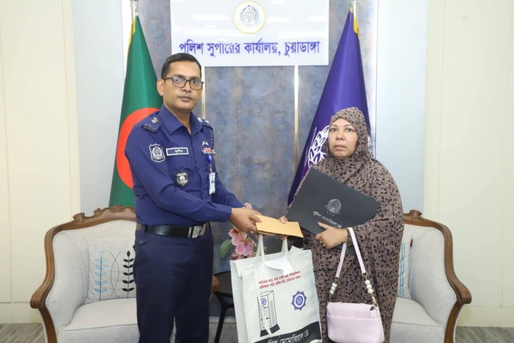 পবিত্র ঈদুল ফিতর-২০২৬ উপলক্ষে কর্তব্যরত অবস্থায় জীবন উৎসর্গকারী পুলিশ সদস্যদের পরিবারের মাঝে ঈদ শুভেচ্ছা ও উপহার সামগ্রী প্রদান করা হয়েছে।কর্তব্যের তরে করে গেল যারা, আত্মবলিদান প্রতিক্ষণে স্মরি, রাখিব ধরি তোমাদের সম্মান”—এই অঙ্গীকারকে সামনে রেখে বাংলাদেশ পুলিশের ইন্সপেক্টর জেনারেল (আইজিপি) মো. আলী হোসেন ফকিরের পক্ষ থেকে এ উদ্যোগ গ্রহণ করা হয়। বুধবার (১১ মার্চ ২০২৬) দুপুর ১টা ৫০ মিনিটে চুয়াডাঙ্গা পুলিশ সুপারের কার্যালয়ের অফিস কক্ষে আয়োজিত এক অনুষ্ঠানে আইজিপি কর্তৃক প্রেরিত ঈদের শুভেচ্ছা সামগ্রী আনুষ্ঠানিকভাবে হস্তান্তর করা হয়। অনুষ্ঠানে কর্তব্যরত অবস্থায় জীবন উৎসর্গকারী দুইজন পুলিশ সদস্যের পরিবারের হাতে খাদ্য উপকরণ ও ঈদ উপহার তুলে দেন চুয়াডাঙ্গা জেলার পুলিশ সুপার মোহাম্মদ মনিরুল ইসলাম। এসময় পুলিশ সুপার শহীদ পুলিশ সদস্যদের পরিবারের খোঁজখবর নেন এবং যেকোনো প্রয়োজনে জেলা পুলিশ সবসময় তাদের পাশে থাকবে বলে আশ্বাস প্রদান করেন।অনুষ্ঠানে জেলা পুলিশের ঊর্ধ্বতন কর্মকর্তারা উপস্থিত ছিলেন।