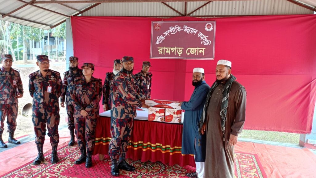 খাগড়াছড়ির রামগড় উপজেলায় গরিব ও অসহায় ক্ষুদ্র নৃ-গোষ্ঠী এবং বাঙালি জনগণের মাঝে ঈদ উপহার, আর্থিক সহায়তা ও বিভিন্ন উপকরণ বিতরণ করেছে বর্ডার গার্ড বাংলাদেশ (বিজিবি) রামগড় জোন। বৃহস্পতিবার সকালে রামগড় জোন সদরে আয়োজিত এক অনুষ্ঠানে এসব সহায়তা প্রদান করেন জোন অধিনায়ক লেফটেন্যান্ট কর্নেল মোঃ আহসান উল ইসলাম। অনুষ্ঠানে উপজেলার গরিব ও অসহায় ক্ষুদ্র নৃ-গোষ্ঠী ও বাঙালি পরিবারের মাঝে ঈদ উপহার বিতরণ করা হয়। এছাড়া মাদ্রাসা ও এতিমখানায় সিলিং ফ্যান প্রদান, একটি মসজিদের নির্মাণকাজের জন্য আর্থিক অনুদান, অগ্নিকাণ্ডে ক্ষতিগ্রস্ত পরিবারের মাঝে ঢেউটিন বিতরণ এবং কয়েকজন অসুস্থ ব্যক্তিকে চিকিৎসার জন্য আর্থিক সহায়তা দেওয়া হয়।