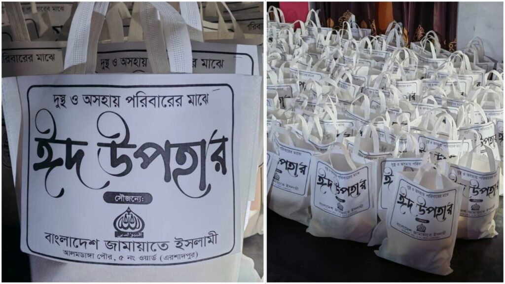 চুয়াডাঙ্গা জেলার আলমডাঙ্গা পৌরসভার ৫নং ওয়ার্ড (এরশাদপুর) এলাকায় বাংলাদেশ জামায়াতে ইসলামী’র উদ্যোগে হতদরিদ্র ও অসহায় মানুষের মাঝে ঈদ উপহার সামগ্রী বিতরণ করা হয়েছে। গত ১৯ মার্চ (বৃহস্পতিবার) রাত আনুমানিক ৮টার দিকে এ কর্মসূচি অনুষ্ঠিত হয়। এসময় প্রায় ৮৫টি অসহায় ও দরিদ্র পরিবারের মাঝে ঈদ সামগ্রী বিতরণ করা হয়, যা তাদের মাঝে ঈদের আনন্দ ভাগাভাগিতে সহায়ক ভূমিকা রাখবে বলে আয়োজকরা জানান। অনুষ্ঠানে প্রধান অতিথি হিসেবে উপস্থিত ছিলেন আলমডাঙ্গা পৌর বাইতুল মাল সম্পাদক ও ৫নং ওয়ার্ড কাউন্সিলর প্রার্থী মাওলানা আব্দুল হান্নান। এছাড়াও উপস্থিত ছিলেন ৫নং ওয়ার্ড জামায়াতে ইসলামী’র আমীর নাজমুস সালেহীন, সেক্রেটারি মোঃ আল আমিন হোসাইনসহ ওয়ার্ডের বিভিন্ন পর্যায়ের দায়িত্বশীল নেতৃবৃন্দ। এসময় বক্তারা বলেন, সমাজের সুবিধাবঞ্চিত মানুষের পাশে দাঁড়ানোই ইসলামের মূল শিক্ষা। প্রতি বছরের ন্যায় এবারও তারা দরিদ্র মানুষের মাঝে ঈদের আনন্দ পৌঁছে দিতে এই উদ্যোগ গ্রহণ করেছেন। ভবিষ্যতেও এ ধরনের সামাজিক কার্যক্রম অব্যাহত থাকবে বলে তারা আশাবাদ ব্যক্ত করেন। স্থানীয়রা এই উদ্যোগকে স্বাগত জানিয়ে আয়োজকদের প্রতি কৃতজ্ঞতা প্রকাশ করেন এবং এমন মানবিক কার্যক্রম আরও বিস্তৃত করার আহ্বান জানান।