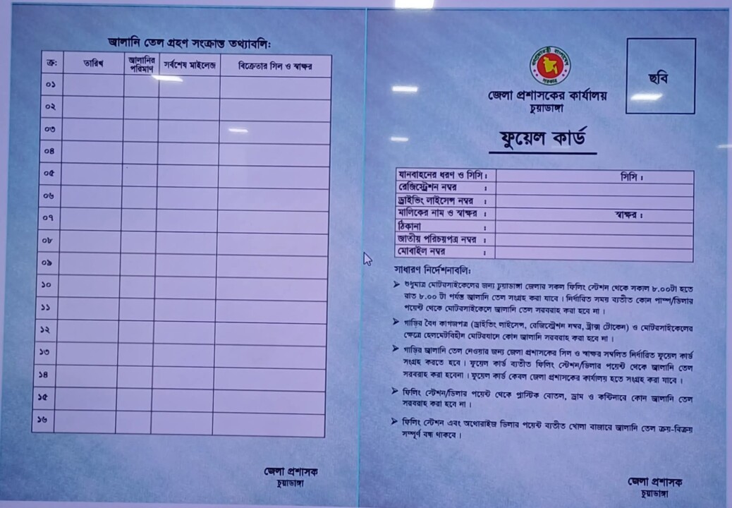 জ্বালানি তেল সরবরাহে শৃঙ্খলা ফিরিয়ে আনতে চুয়াডাঙ্গা জেলায় আগামী ১ এপ্রিল থেকে ফুয়েল কার্ড ব্যবস্থা চালু করতে যাচ্ছে জেলা প্রশাসন। এদিন থেকে জেলার সকল পেট্রোল পাম্পে যানবাহনে তেল নিতে হলে সংশ্লিষ্ট গাড়ির জন্য নির্ধারিত ফুয়েল কার্ড প্রদর্শন বাধ্যতামূলক করা হয়েছে। কার্ড ছাড়া কোনো যানবাহনে জ্বালানি তেল সরবরাহ করা হবে না বলে প্রশাসনের পক্ষ থেকে জানানো হয়েছে।জেলা প্রশাসন সূত্রে জানা গেছে, ফুয়েল কার্ড সংগ্রহের জন্য আগামী ৩০ ও ৩১ মার্চ জেলা প্রশাসকের কার্যালয়ে নির্ধারিত কাগজপত্র জমা দিতে হবে। এ জন্য গাড়ির ড্রাইভিং লাইসেন্স ও রেজিস্ট্রেশন কার্ডের ফটোকপি এবং এক কপি পাসপোর্ট সাইজ ছবি জমা দিতে বলা হয়েছে।সংশ্লিষ্ট কর্মকর্তারা জানান, সাম্প্রতিক সময়ে জ্বালানি তেলের সরবরাহ ও বিতরণ ব্যবস্থায় অনিয়ম, অতিরিক্ত মজুদ এবং কালোবাজারির অভিযোগের প্রেক্ষিতে এ উদ্যোগ নেওয়া হয়েছে। ফুয়েল কার্ড চালুর মাধ্যমে নির্দিষ্ট যানবাহনের জন্য নির্ধারিত পরিমাণ তেল সরবরাহ নিশ্চিত করা সম্ভব হবে বলে তারা আশা করছেন।এছাড়া এই ব্যবস্থার মাধ্যমে কোন যানবাহন কতটুকু জ্বালানি গ্রহণ করছে তার একটি সুনির্দিষ্ট তথ্যভাণ্ডার তৈরি হবে, যা ভবিষ্যতে জ্বালানি ব্যবস্থাপনা ও তদারকিতে সহায়ক ভূমিকা রাখবে। এতে করে জ্বালানির অপচয় রোধ এবং সুষম বণ্টন নিশ্চিত করা যাবে বলেও মনে করছে প্রশাসন।জেলা প্রশাসন আরও জানিয়েছে, নতুন এই নির্দেশনা বাস্তবায়নে কঠোর নজরদারি থাকবে। কোনো পেট্রোল পাম্প ফুয়েল কার্ড ছাড়া তেল সরবরাহ করলে সংশ্লিষ্টদের বিরুদ্ধে আইনগত ব্যবস্থা গ্রহণ করা হবে।এদিকে, ফুয়েল কার্ড ব্যবস্থা চালুর খবরে স্থানীয় পরিবহন চালক ও সাধারণ মানুষের মধ্যে মিশ্র প্রতিক্রিয়া দেখা গেছে। অনেকেই এটিকে জ্বালানি খাতে শৃঙ্খলা ফিরিয়ে আনার একটি ইতিবাচক পদক্ষেপ হিসেবে দেখছেন, আবার কেউ কেউ প্রাথমিক পর্যায়ে কিছু ভোগান্তির আশঙ্কা প্রকাশ করেছেন।সংশ্লিষ্টরা মনে করছেন, যথাযথ বাস্তবায়ন ও তদারকি নিশ্চিত করা গেলে ফুয়েল কার্ড ব্যবস্থা জ্বালানি ব্যবস্থাপনায় স্বচ্ছতা ও নিয়ন্ত্রণ প্রতিষ্ঠায় গুরুত্বপূর্ণ ভূমিকা রাখবে।