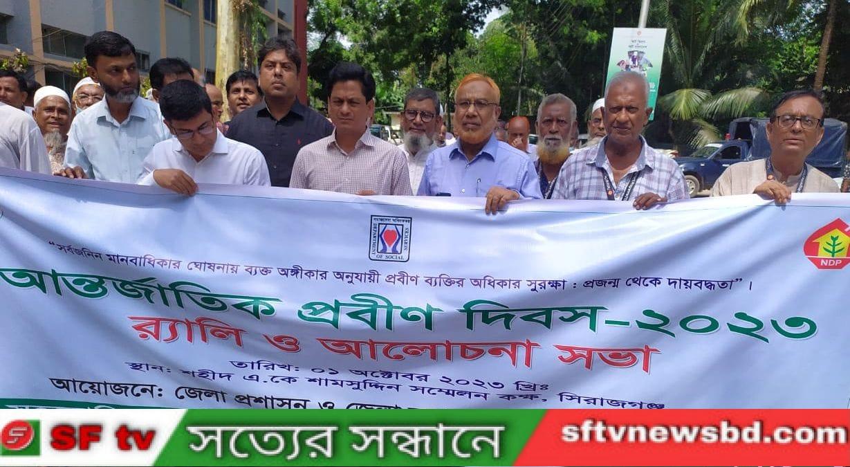 "সর্বজনীন মানবাধিকার ঘোষণায় ব্যক্ত অঙ্গীকার অনুযায়ী প্রবীণ ব্যক্তির অধিকার সুরক্ষাঃ প্রজন্ম থেকে দায়বদ্ধতা" এই প্রতিপাদ্যকে সামনে নিয়ে -সিরাজগঞ্জে ৩৩ তম আন্তর্জাতিক প্রবীণ দিবস উপলক্ষে র্যালি প্রদর্শন ও আলোচনা সভা অনুষ্ঠিত হয়েছে।